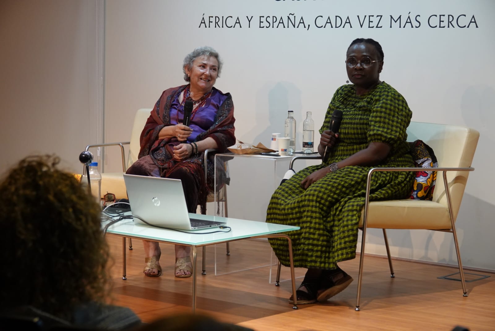 La profesora universitaria, hispanista y escritora Odome Angone, el pasado 24 de febrero en la mediateca de Casa África, y la escritora ugandesa Jennifer Nansubuga con su traductora Marta Sofía López, en Casa África.. Imagen: © Casa África